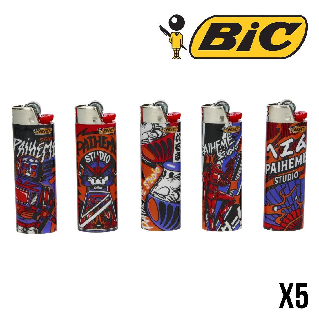 Chaque briquet Bic Maxi à pierre arbore des motifs graphiques multicolores (rouge, noir, blanc, bleu) sur un corps brillant.