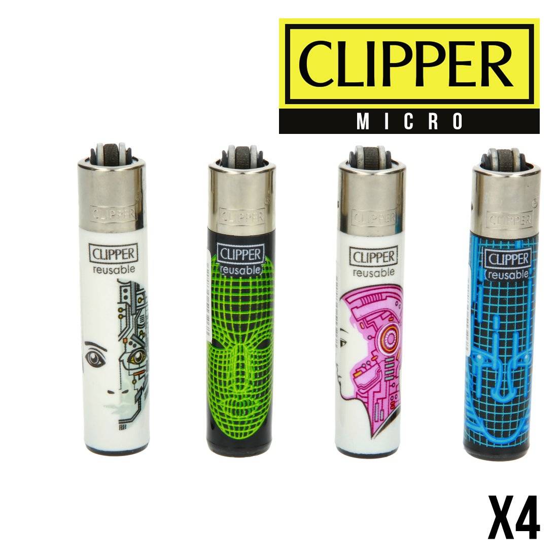 Le Micro Clipper AI Faces réunit quatre briquets Clipper au format micro CP22, chacun habillé d’un visuel inspiré par l’univers des visages numériques et des lignes robotiques.