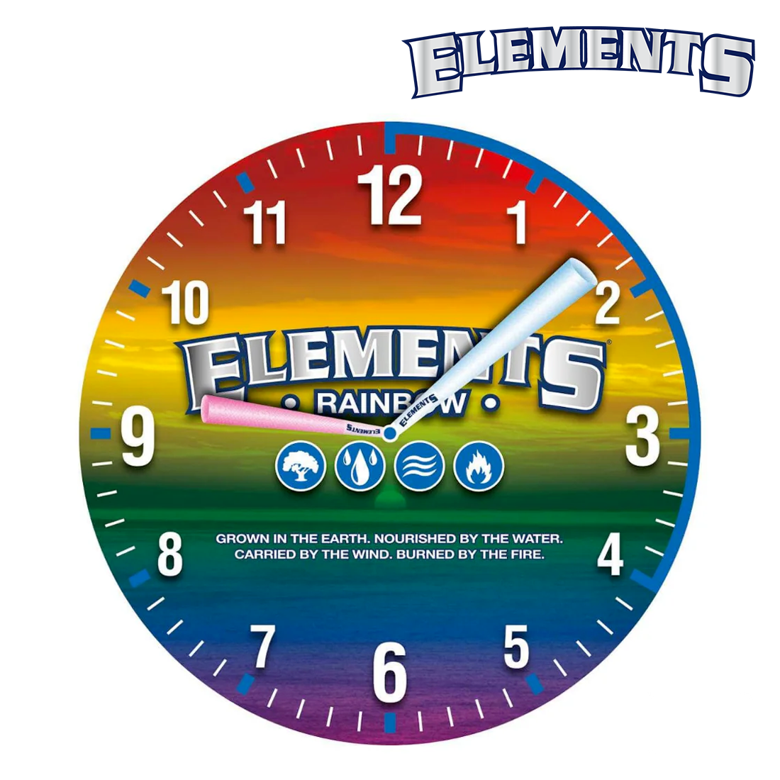 Au centre, la mention "Elements Rainbow" accompagne la phrase "Grown in the earth. Nourished by the water. Carried by the wind. Burned by the fire."