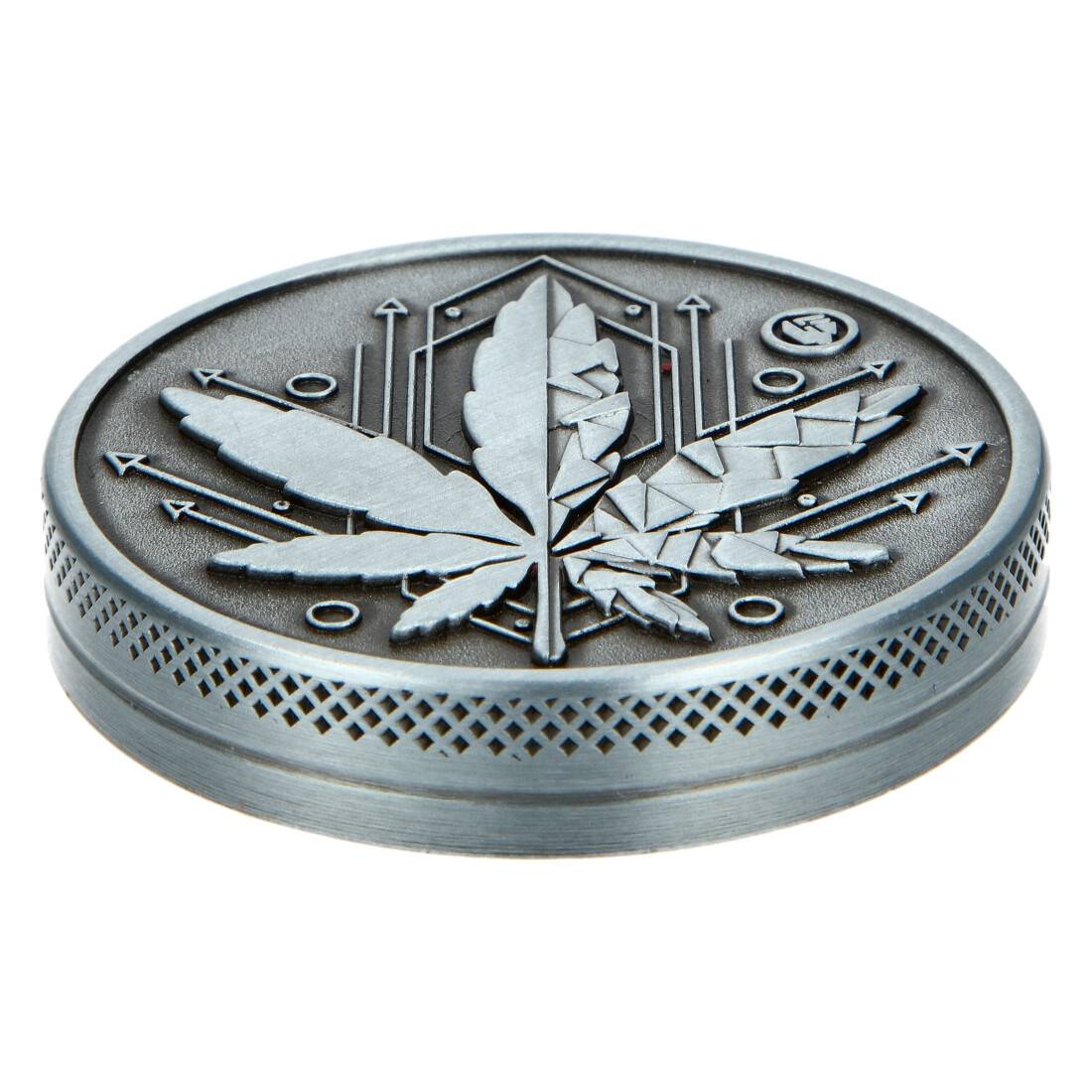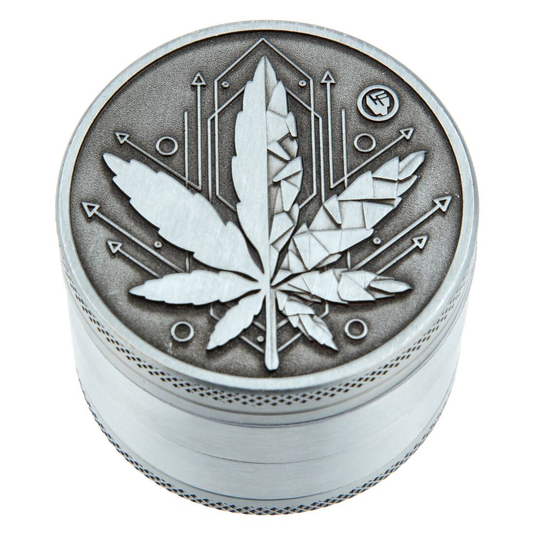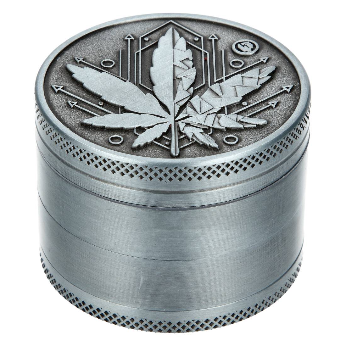 Le modèle Silver Geo présente sur son couvercle magnétique une jolie décoration en 3D d'une feuille de chanvre illustrée de manière géométrique et est conçu en quatre parties, dont un tamis pour collecter les particules les plus précieuses.