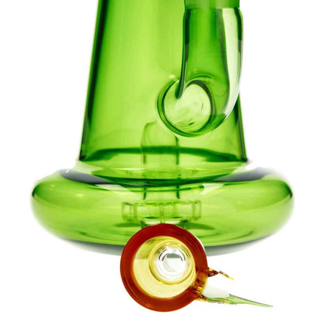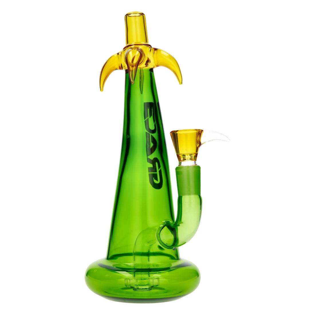 L’embouchure et le sommet évoquent un feuillage tropical, accentué par une teinte verte vive qui contraste avec le corps en verre transparent.